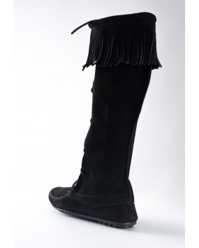 Stand out at the next festival with these iconic lace-up boots. A fashion essential for celebrities and trendsetters, these boho-chic moccasin boots lace up to just below the knee. Made by hand today from the same sleek design that was introduced in 1968. Long rawhide laces elongate your look while simple fringe dances down from the boot tops with every step.
