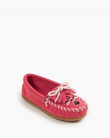 Soft suede and a cotton lace ensures classic stay-put style as they slip on and go. Traditional moccasin stitching frames the iconic hand-beaded Thunderbird design to give classic vintage flair while the cushioned rubber sole provides grip and easy comfort. These time-honored kids moccasins will be their go-to favorite for a long time.