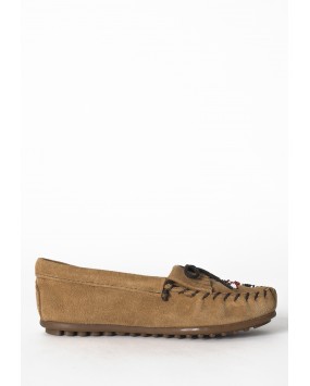 Soft suede and a cotton lace ensures classic stay-put style as they slip on and go. Traditional moccasin stitching frames the iconic hand-beaded Thunderbird design to give classic vintage flair while the cushioned rubber sole provides grip and easy comfort. These time-honored kids moccasins will be their go-to favorite for a long time.